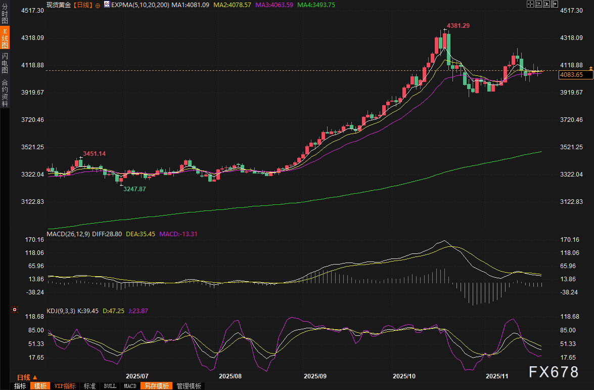 汇通财经APP讯——周四(11月20日)现货黄金在剧烈震荡中顽强收稳,收报4077.17美元/盎司,全天最高冲至4110.03美元,最低跌至4038.82美元,波动幅度超过70美元。这波看似平静的横盘,实则暗流涌动——美国迟来的9月非农就业报告彻底打乱了市场节奏,既浇灭了部分降息幻想,又因为失业率意外抬升而重新点燃了鸽派希望。黄金作为最敏感的利率交易品种,再一次站在了风口浪尖。周五(11月21日)亚市早盘,现货黄金窄幅震荡,目前交投于4085美元/盎司附近,市场目光开始聚焦美国提出的俄乌和平计划。